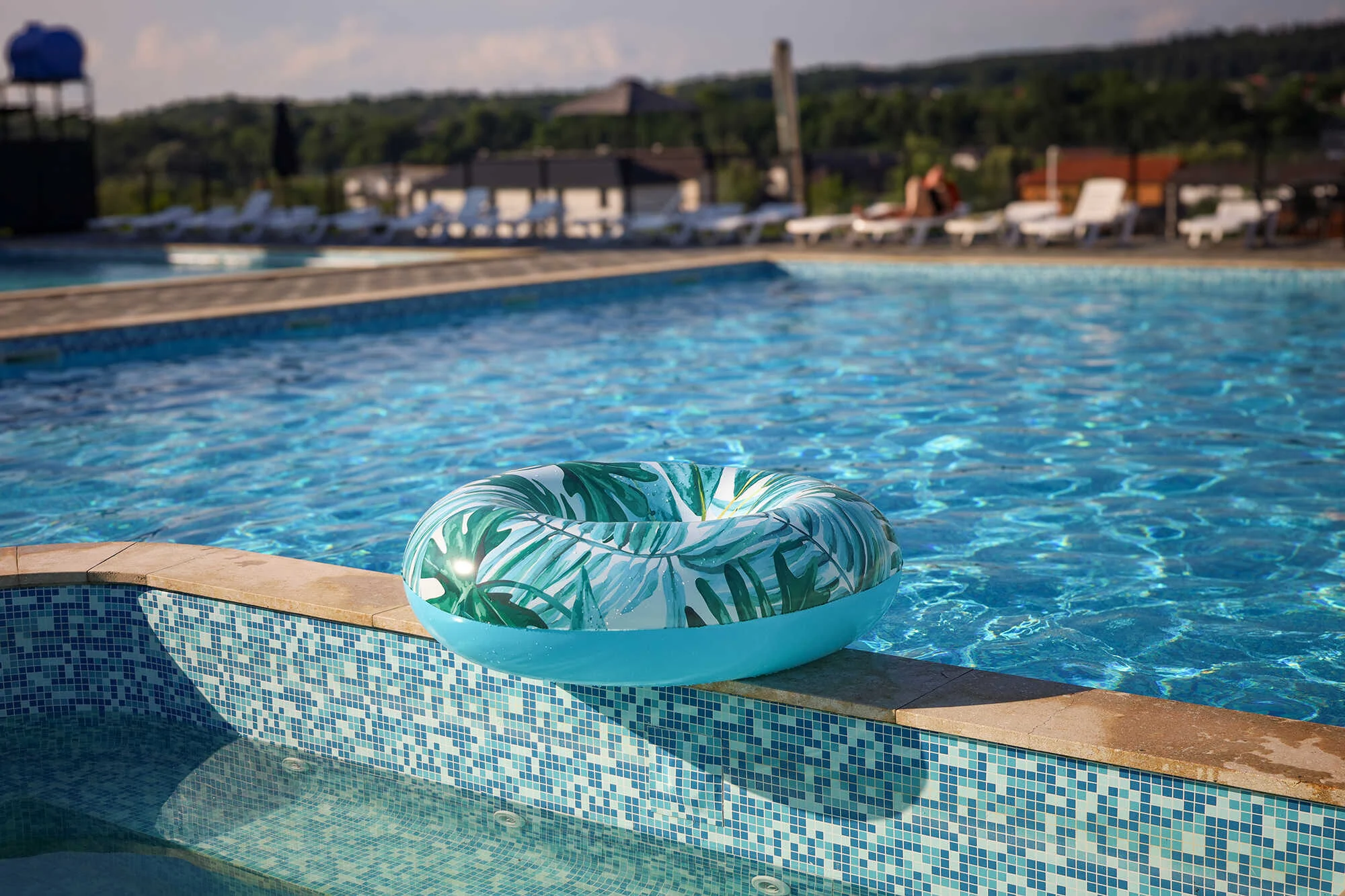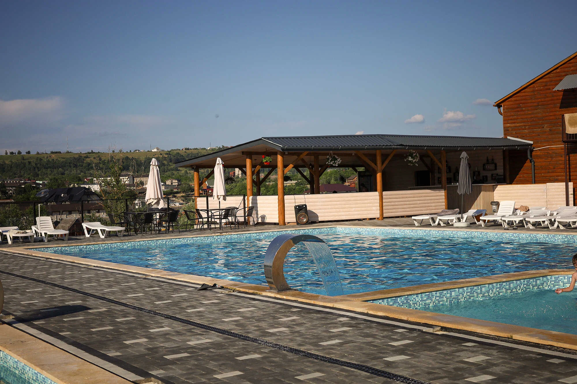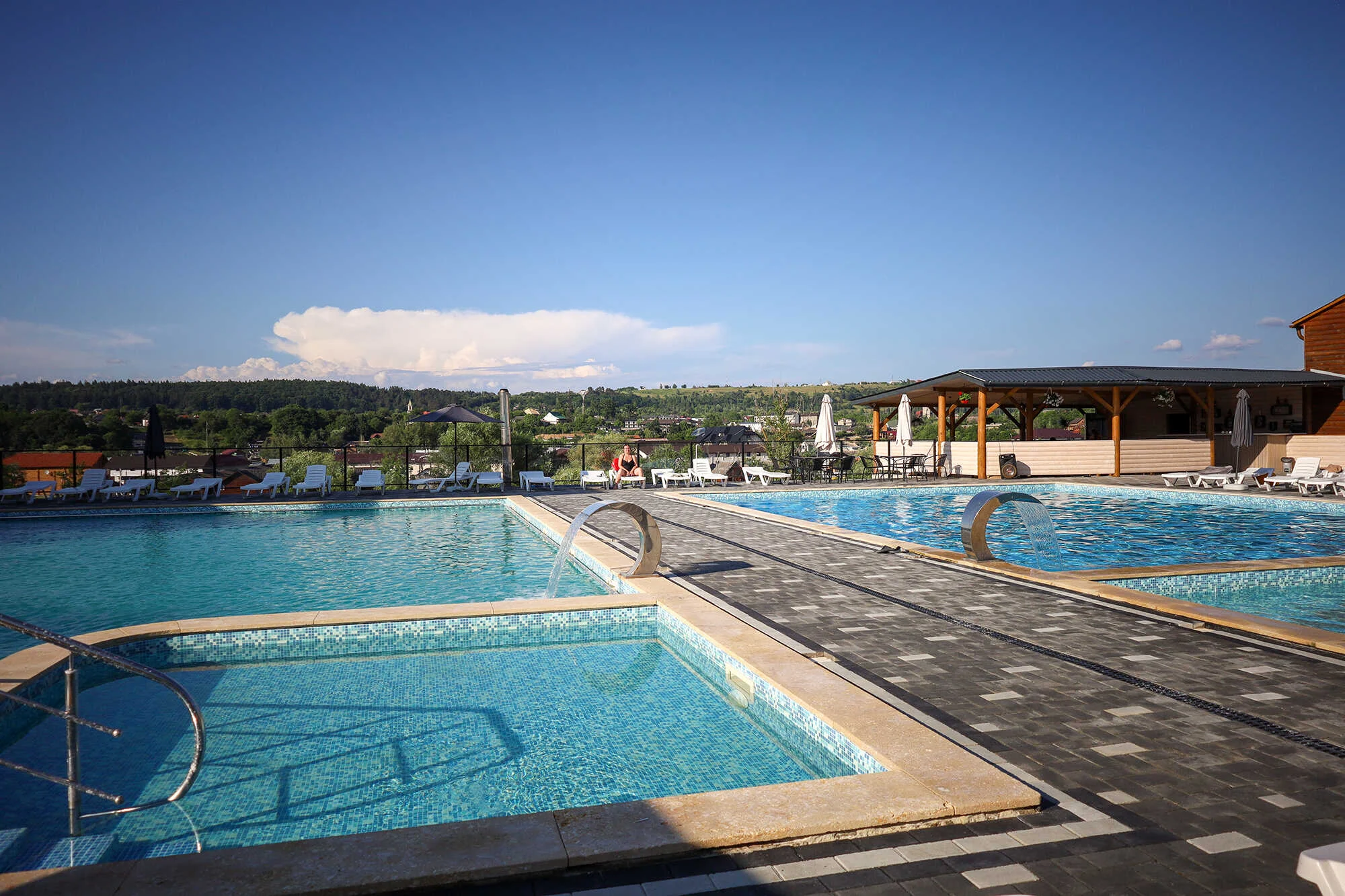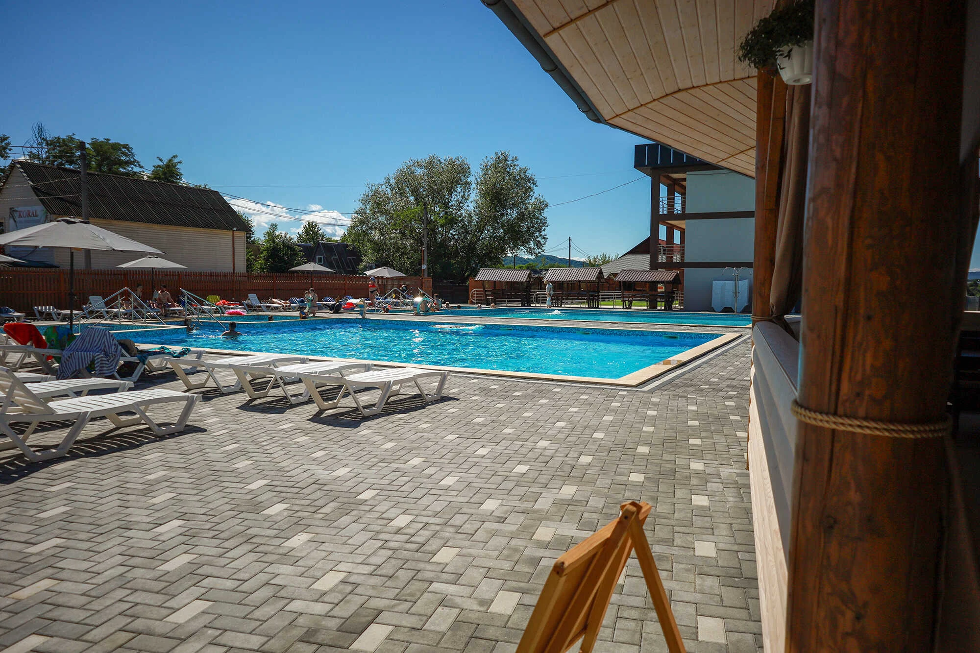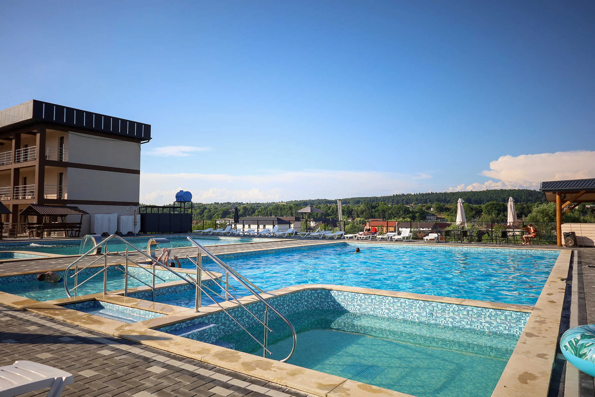 На території бази є 2 басейни (з солоною та прісною водою), дитячий басейн та джакузі, душові кабіни з гарячою водою, роздягальні.